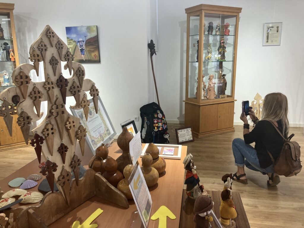 Os visitantes podem observar fotografias dos diferentes caminhos de Santiago e do património que atravessam, objetos relacionados com a peregrinação jacobeia, imagens, símbolos e estatuetas de Santiago. Há ainda um conjunto de histórias ilustradas de peregrinos, recordações, peças de artesanato e o pote da típica queimada galega.